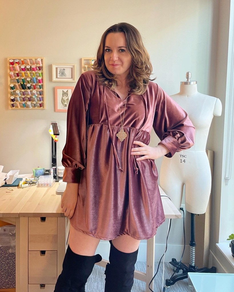 To start, I ordered mauve stretch velvet from a shop on Etsy. I couldn’t find something that was both a mauve color match and crushed velvet (which is what the dress in the show is made of), so I picked color matching over exact texture matching.