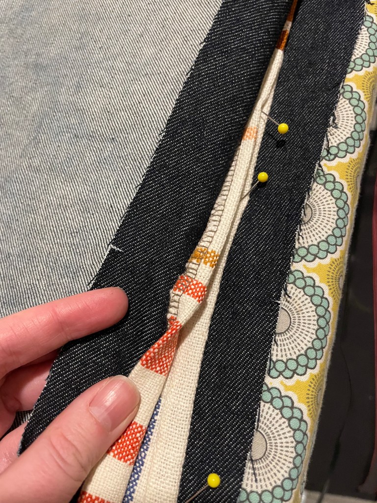 To make the double fronts, I held up paper to see what size rectangle I wanted to add to the fronts of my jeans. I ended up with a paper template of a rectangle that was 24″ by 9.5″, including 1/2″ on all sides for seam allowances. To put them together, I placed scraps of different sizes on top of the paper template until I had a rough idea of what they would look like, then pieced them together and finished all seams with my serger. I washed and dried the patches to remove dye loss and shrinkage – they lost an inch in length and a quarter inch in width, which was just fine. To get them onto the fronts of the jeans, I folded and pressed the 1/2″ seam allowance and then pinned in place on the front leg pieces, with the tops of the patches in line with the end of the zipper placement. My favorite way to ensure symmetry on both legs is to do a sandwich of fabric – placing and pinning the first patch right side up on one leg, then the second patch right side down. Line up the second leg with right side down as the very top layer and pin – now they are mirrored almost perfectly!